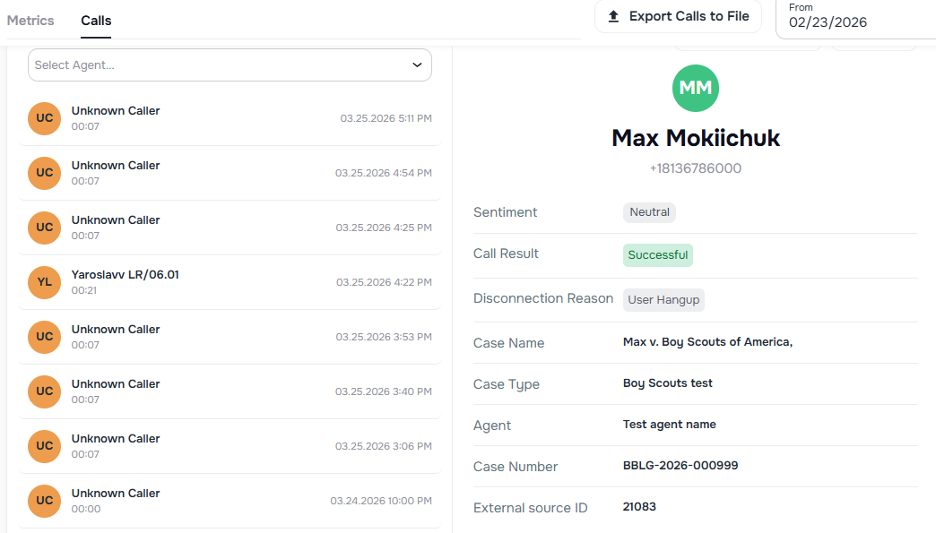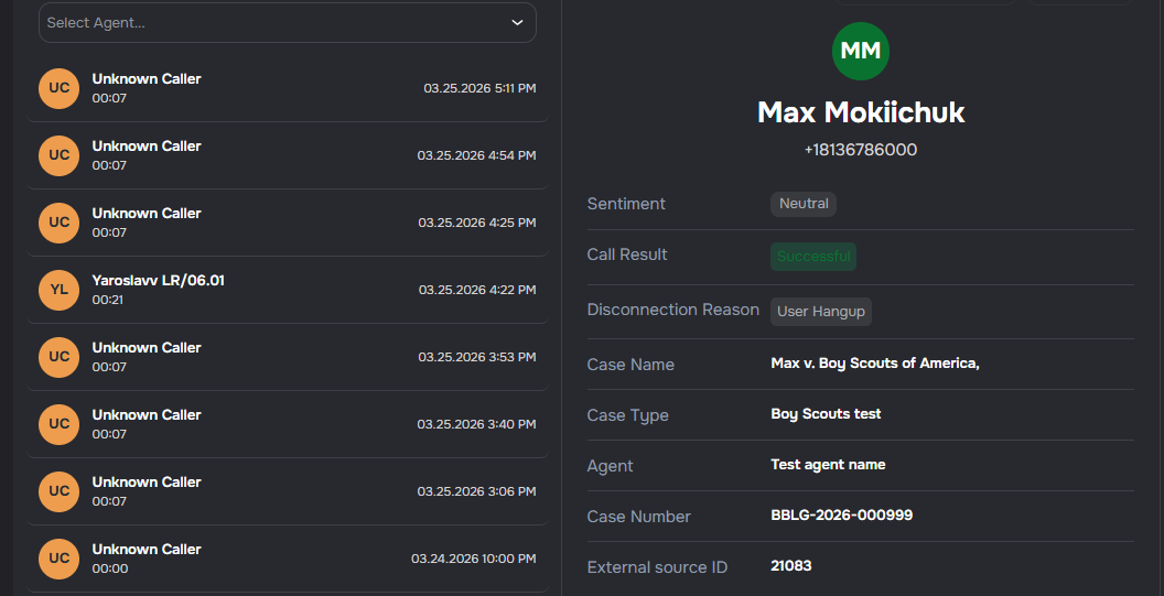 - Sortable columns — sort by call ID, client name, case name, success status, or creation date