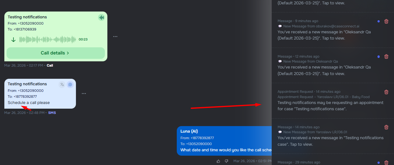 - Document upload notifications — when clients upload documents through inbound messages, admins receive both email and in web notifications with file details and the associated case