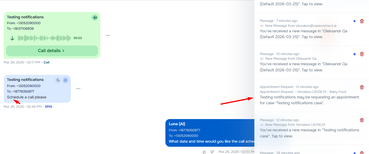 - Appointment request alerts — when a client message contains appointment-related keywords (such as "appointment," "schedule," or "call back"), admins receive notifications