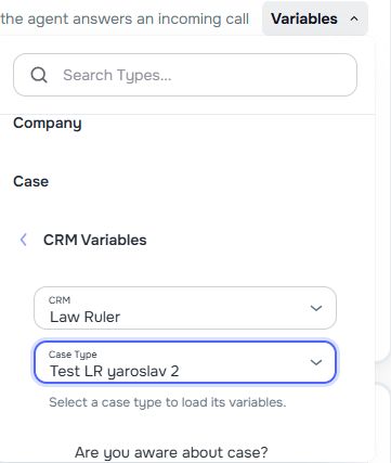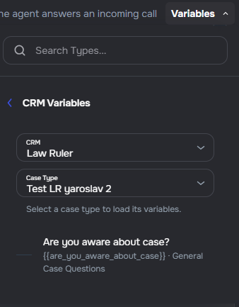 - CRM variable picker — open the variables popover and choose your CRM, integration, and case type to browse all available CRM fields; variables are now sourced directly from the CRM (Law Ruler intake questions / SmartAdvocate UDFs) rather than only showing fields already configured in CRM Mappings