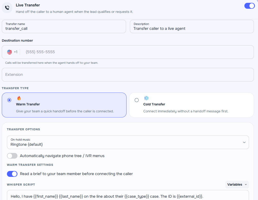 - Knowledge base support — attach a knowledge base during setup so the agent can reference FAQs and firm policies from the first call