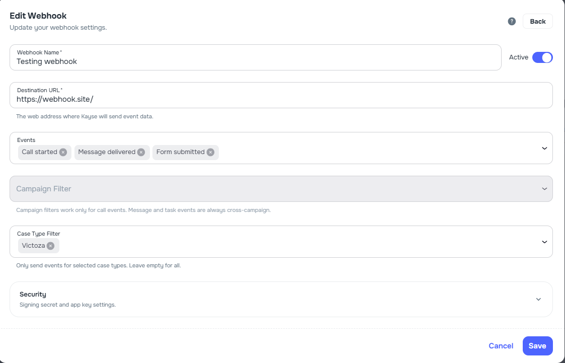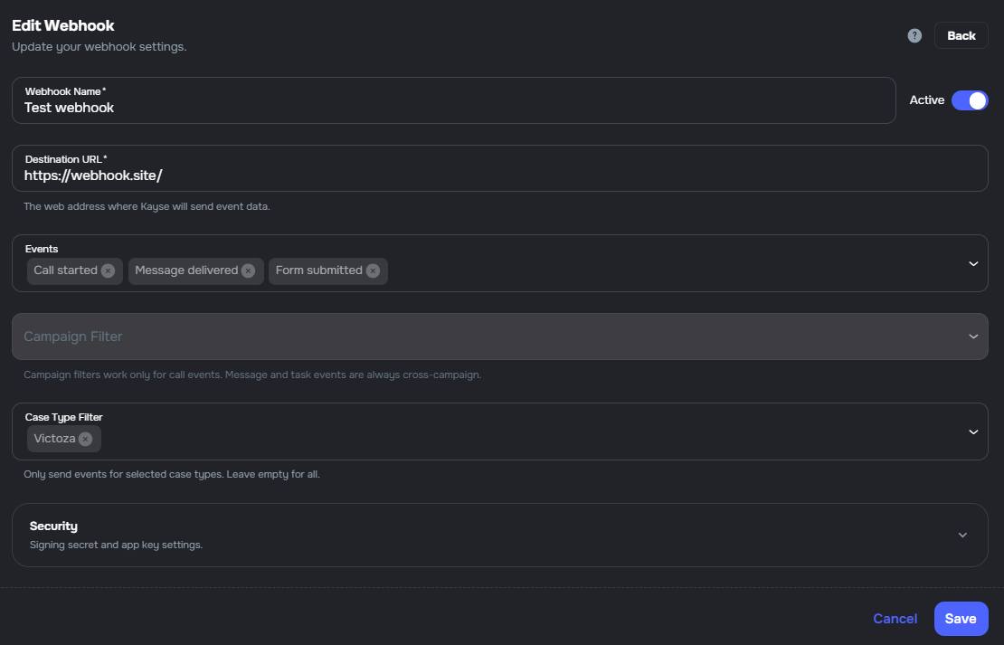 call_started,call_ended,call_analyzed),message_sent(mail, messenger, SMS),task_completed, andform_submitted - Campaign scope — filter by campaign from the webhook form (including from campaign Workflows); call events support campaign filters with validation and helper copy; task-related events respect the same campaign scope when configured