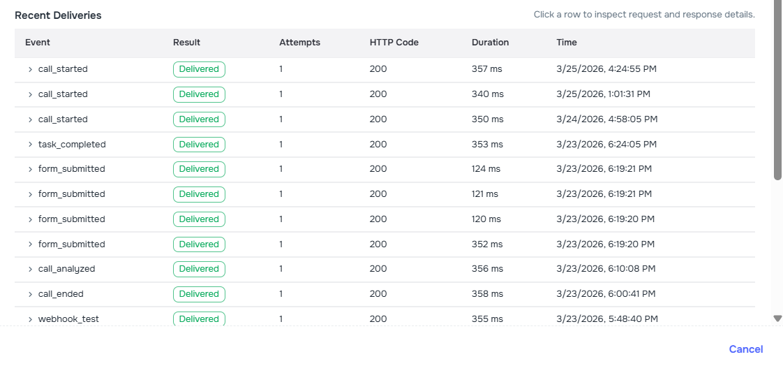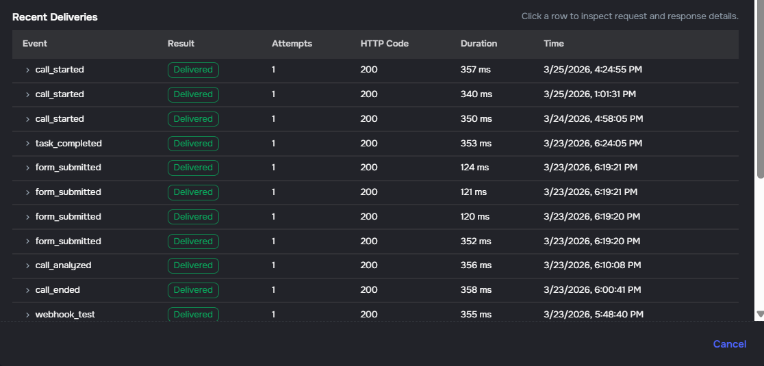 campaign_call_idto identify calls - Reliability — automatic retries with backoff, per-delivery logs, and manual replay for failed deliveries