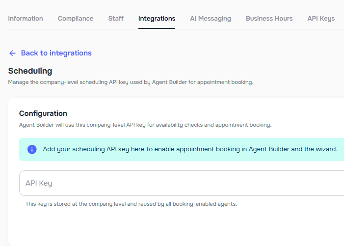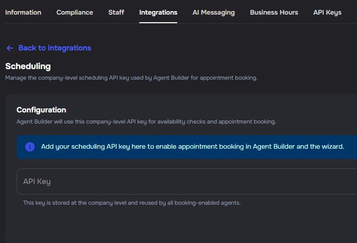 Appointment booking in Agent Builder now uses a company-level scheduling API key managed under Settings → Integrations → Scheduling. The key is stored once and shared by all booking-enabled agents in the company. ✨