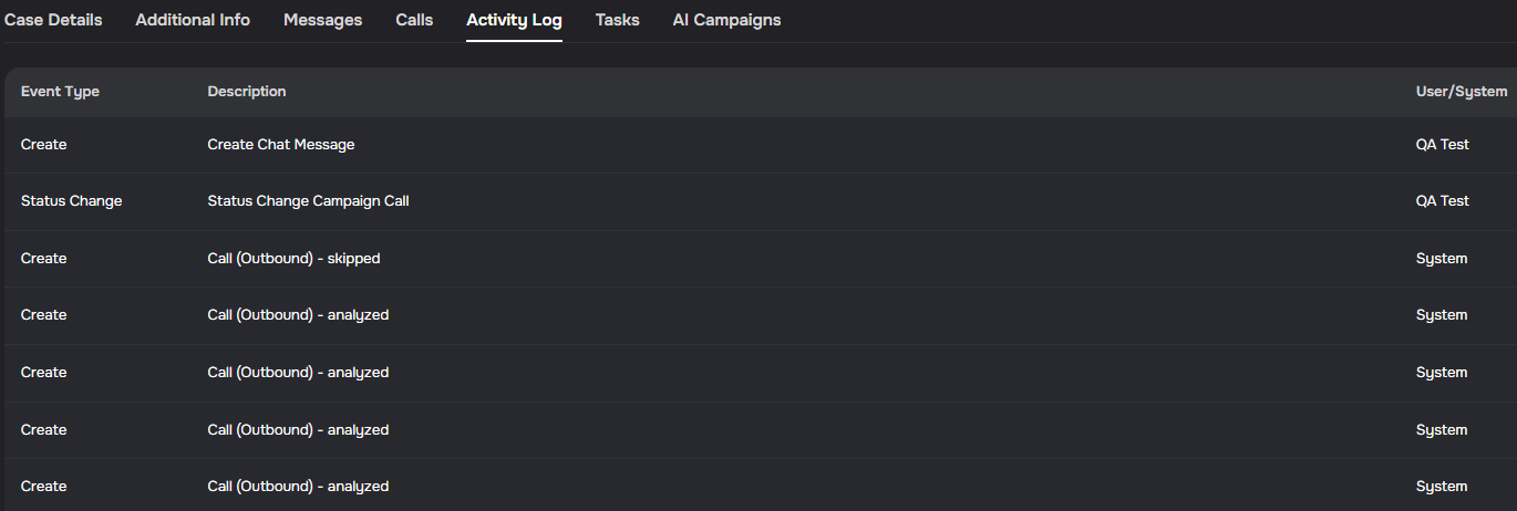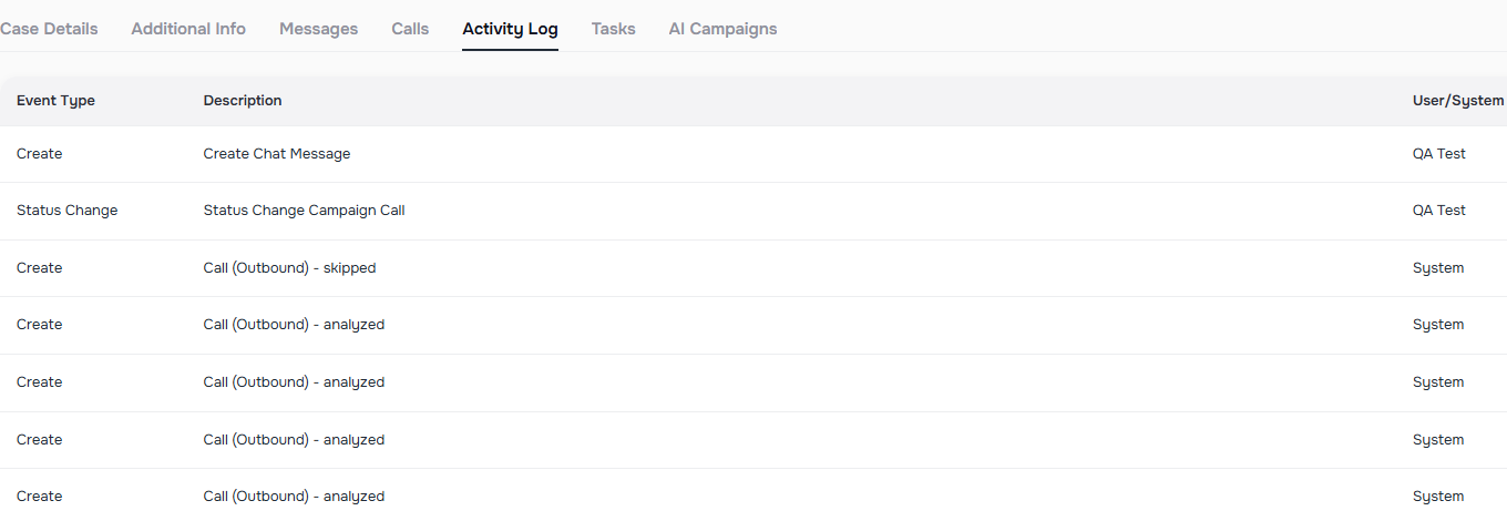 Case details now include an Activity Log tab that shows case-specific history in one timeline. Entries include event type, short description, actor, and timestamp, with newest activity shown first.