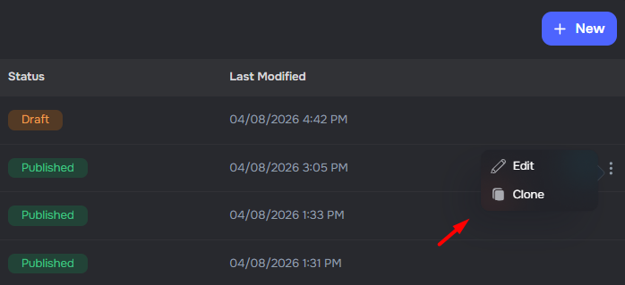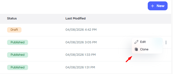 - One-click cloning — use the ⋮ menu on any agent row and select Clone to instantly create a copy