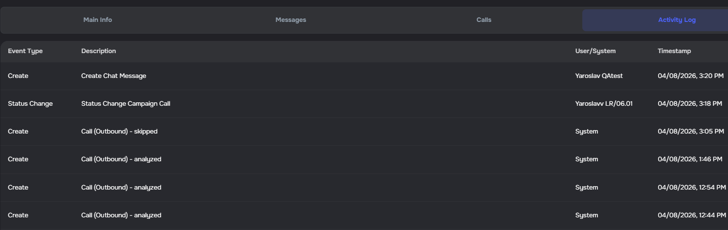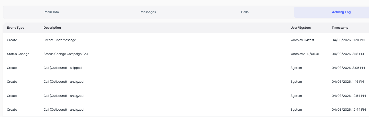 Contact profiles now include an Activity Log tab that shows contact-specific system history in one timeline. Entries include event type, short description, actor (user/system), and timestamp, with newest activity shown first.