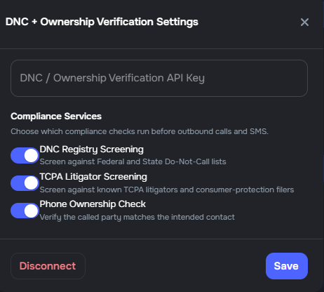 DNC integration settings now include three independent toggles for each compliance service, giving companies precise control over which checks run before outbound calls and SMS.