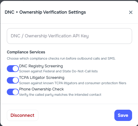 Each toggle can be independently enabled or disabled in Company Settings → Integrations → DNC + Ownership Verification → Settings. All three default to enabled when the integration is first connected. If the Scrub API encounters an error, phone ownership verification continues independently.