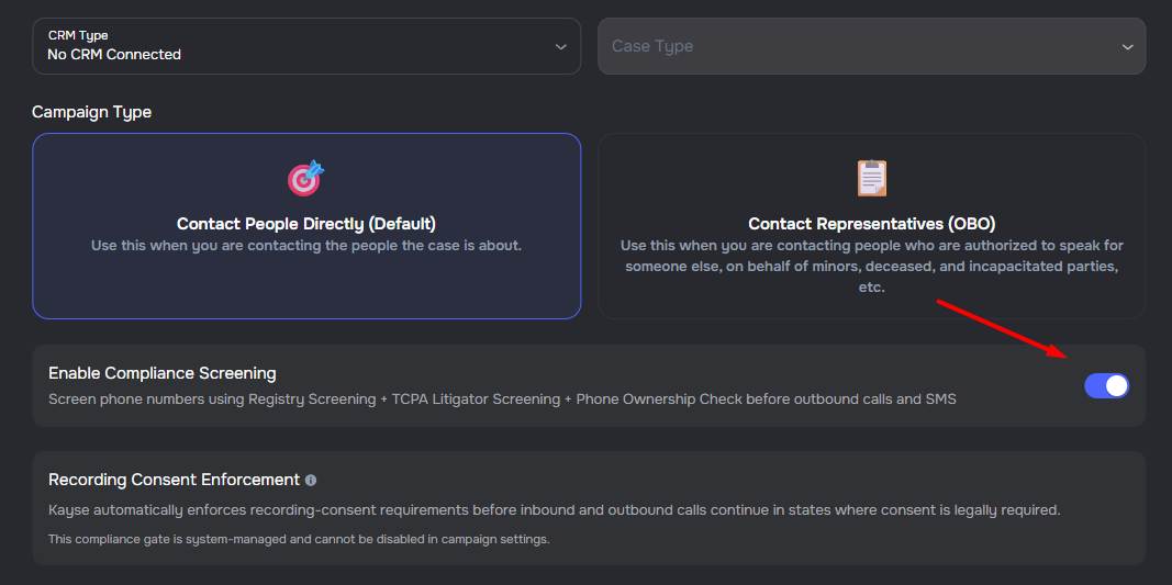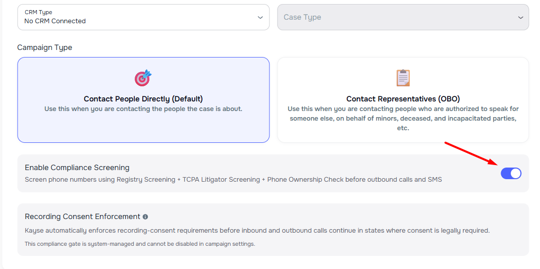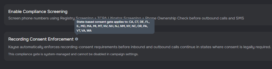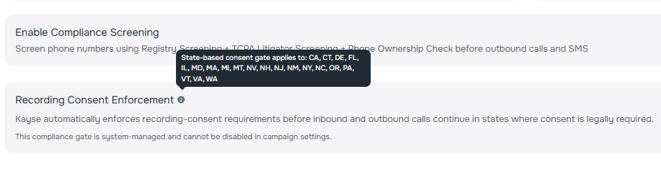 Kayse now automatically enforces recording-consent requirements before inbound and outbound calls continue in states where consent is legally required. The compliance gate applies to calls in CA, CT, DE, FL, IL, MD, MA, MI, MT, NV, NH, NJ, NM, NY, NC, OR, PA, VT, VA, and WA. Callers are presented with a consent message and must clearly agree before the intake flow proceeds. If consent is declined, the call ends politely. This system-managed compliance step cannot be disabled in campaign settings and is visible in the campaign details form.