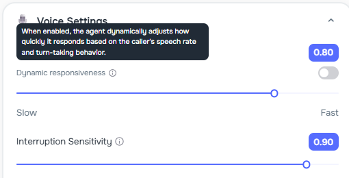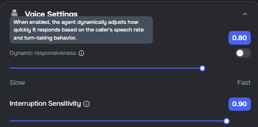 - Dynamic responsiveness toggle — turn on dynamic responsiveness so the agent adjusts how quickly it replies based on the caller's pace