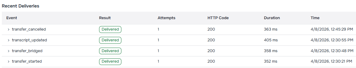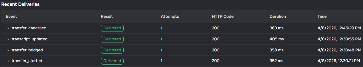 transfer_started,transfer_bridged,transfer_cancelled, andtransfer_endedwebhook events - Transfer outcomes now update the stored bridged transfer destination from live call events instead of waiting for post-call analysis